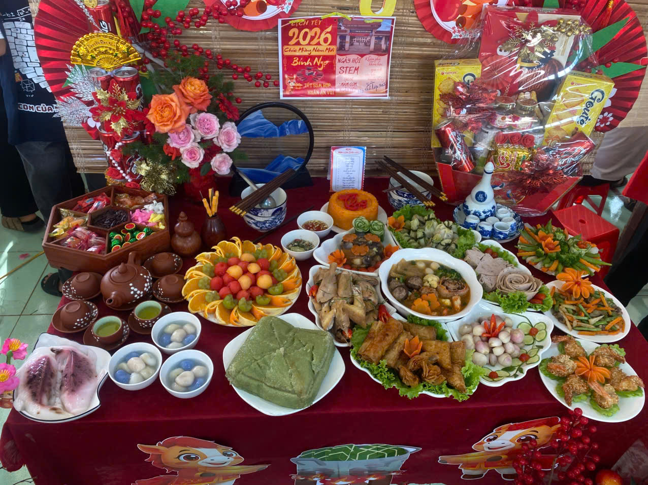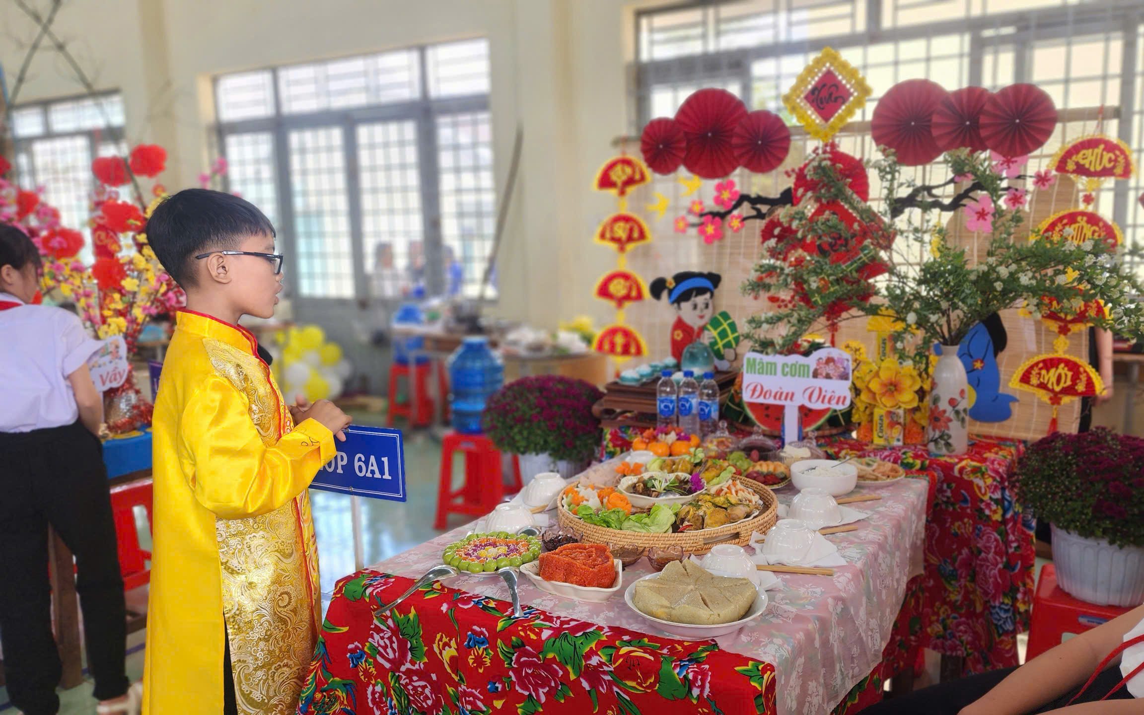 Mâm cơm đoàn viên của các lớp được trưng bày công phu, thể hiện nét đẹp văn hóa Tết truyền thống của các vùng miền.