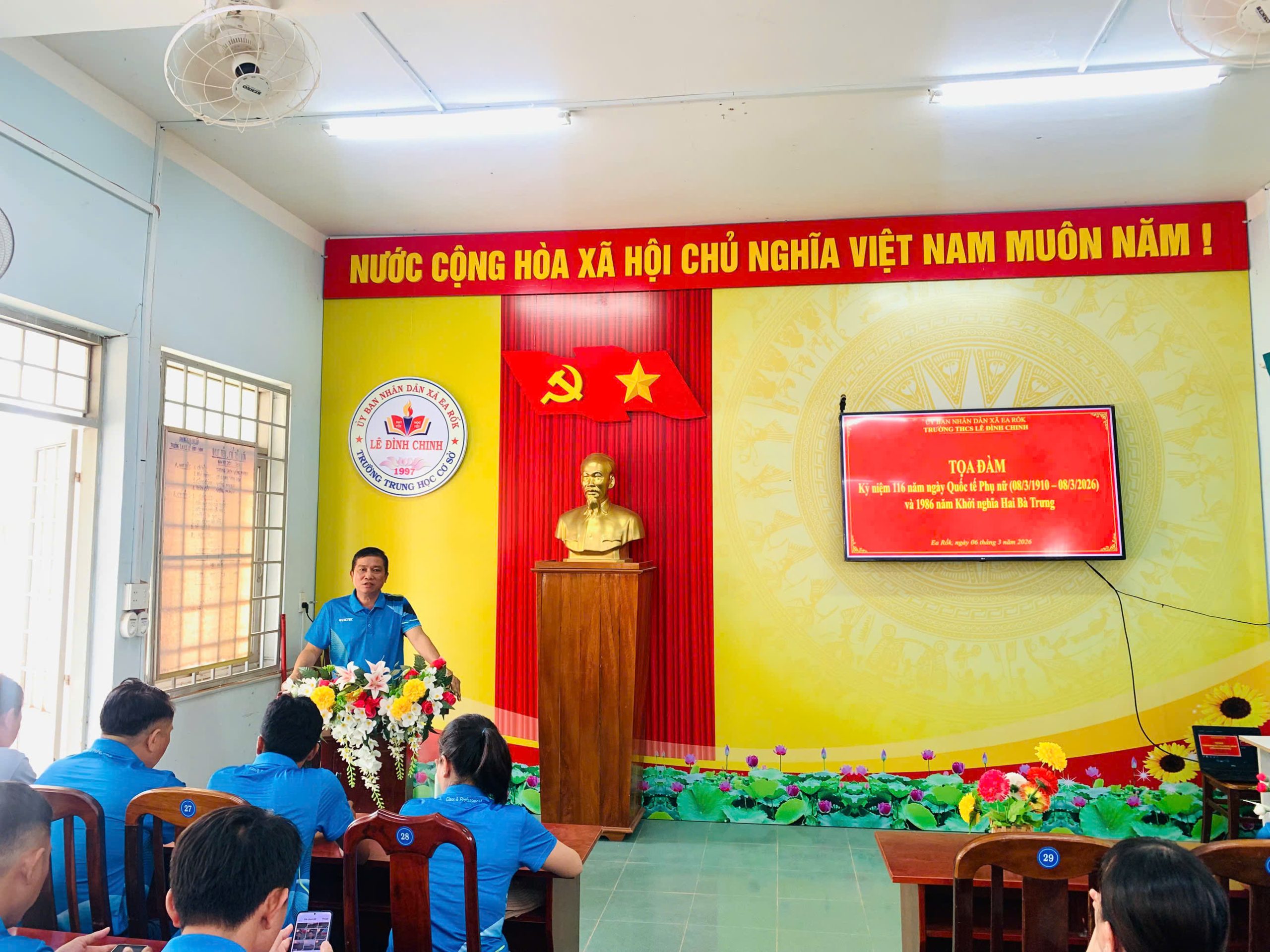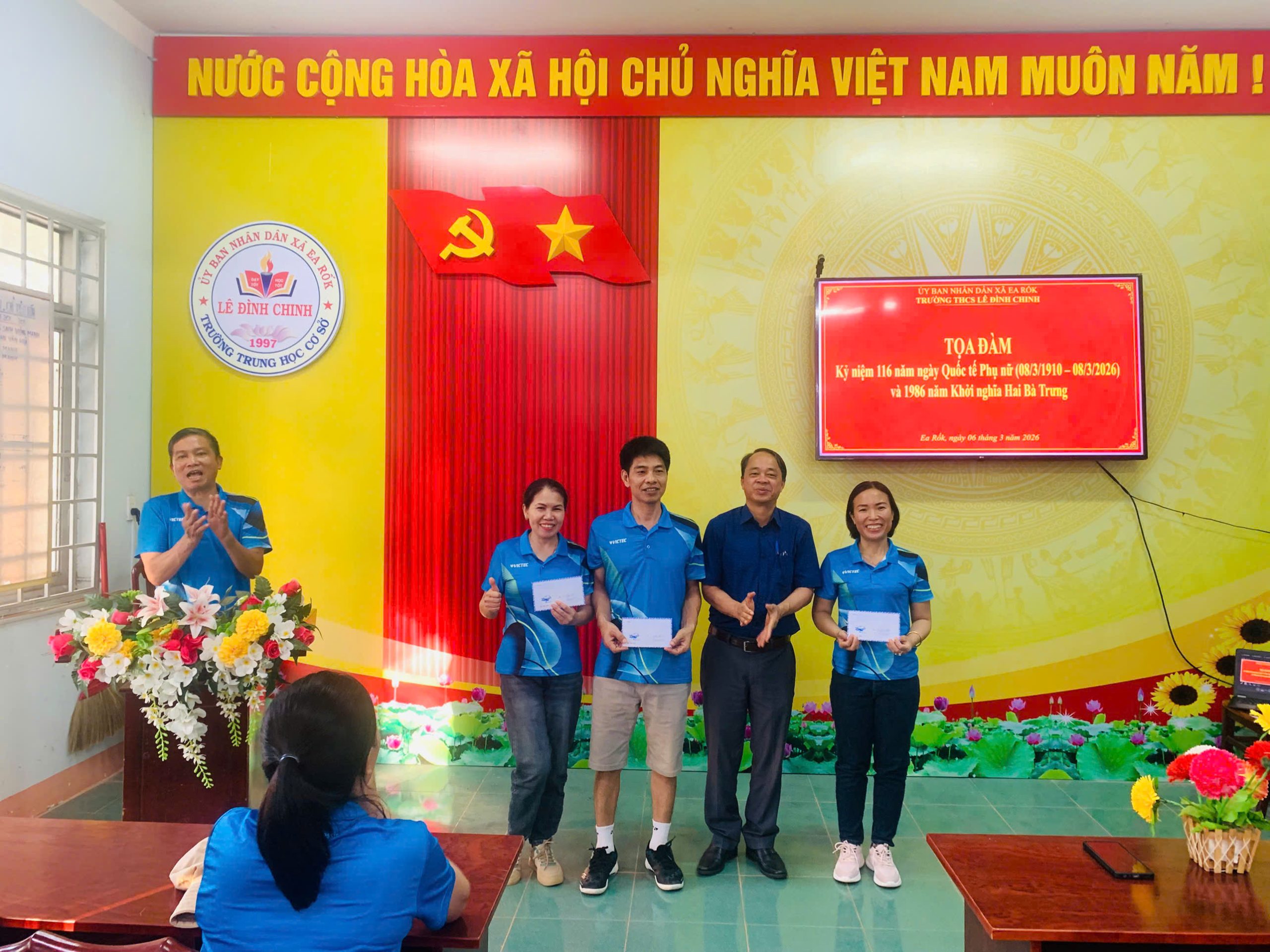 Thiết thực chào mừng kỷ niệm 116 năm Ngày Quốc tế Phụ nữ (08/3/1910 – 08/3/2026) và 1986 năm khởi nghĩa Hai Bà Trưng, chiều ngày 06/3/2026, Trường THCS Lê Đình Chinh (xã Ea Rốk, tỉnh Đắk Lắk) đã tổ chức nhiều hoạt động sôi nổi, ý nghĩa dành cho cán bộ, giáo viên, nhân viên và người lao động trong nhà trường.